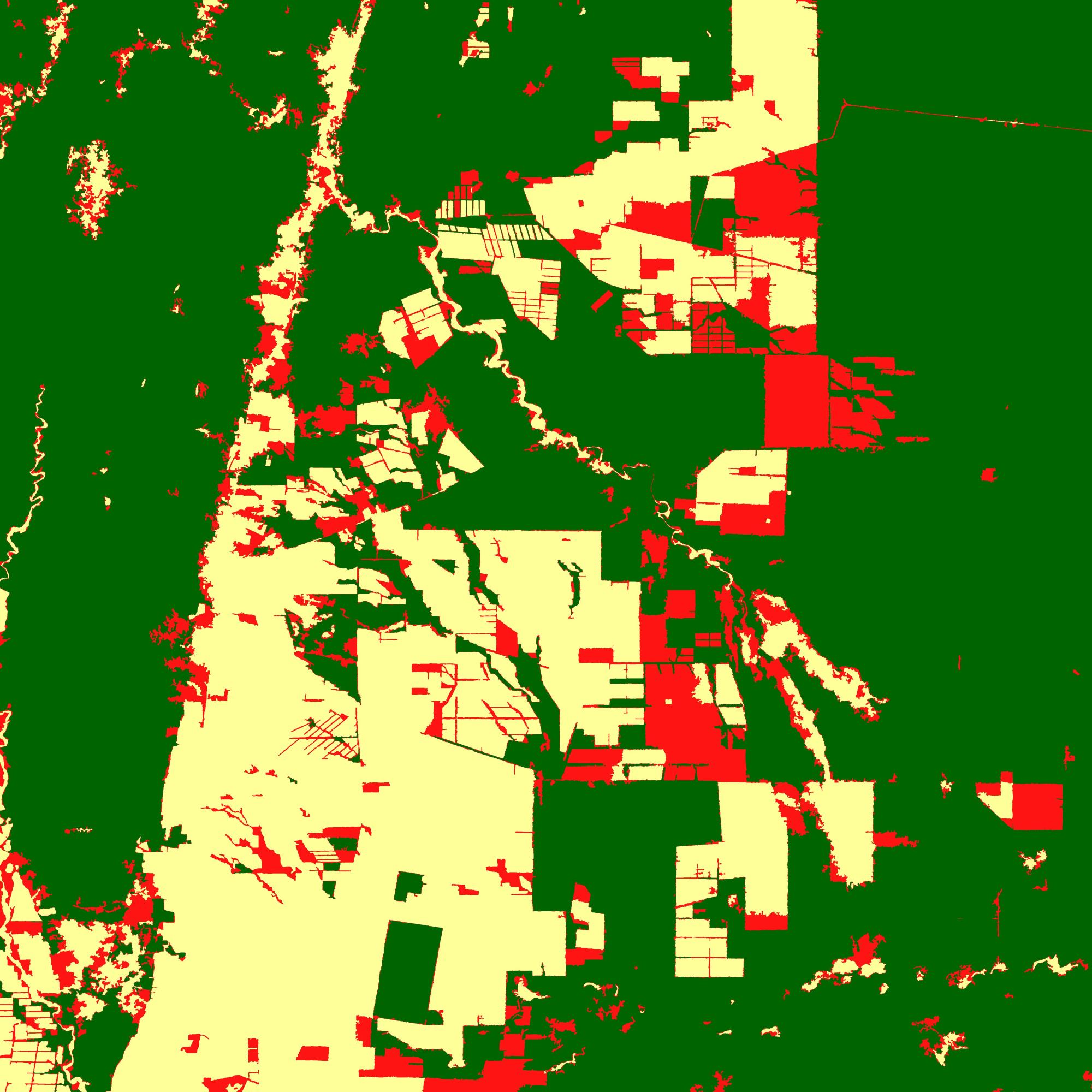 Las escenas comparadas abarcan una superficie de 11 mil kilómetros cuadrados y corresponden a la provincia de Salta en la Argentina. La comparación entre los mapas FNF de 2008 y 2015 arroja que entre esas fechas el 9% de la cobertura determinada por JAXA como bosque se perdió. En el mapa producto de la comparación se puede ver las zonas cubiertas de bosques en color verde, las zonas sin bosque en ambas escenas de tono amarillo y aquellas zonas que tenían cobertura de bosque según los mapas PALSAR en 2008 pero dejaron de tenerlo para 2015, en color rojo.